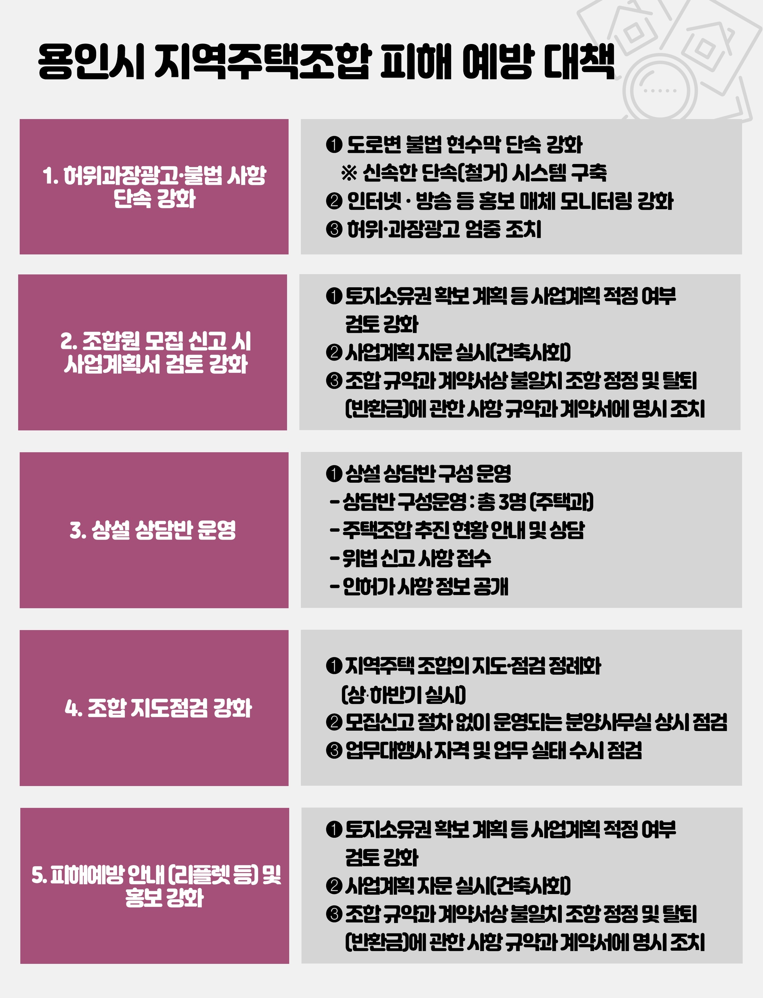 용인특례시, ‘지역주택조합 시민 피해 막자’대책 시행 조합 탈퇴 시민에 분담금 미반환·사업 장기지연·조합원 명의 대출 등 피해 속출 - - 시민 홍보, 허위·과장광고 단속, 상설 상담반 운영, 지역주택조합 지도·점검 강화 김경순 기자 2024-04-04 07:20 가 본문내용 확대/축소 본문 용인특례시, ‘지역주택조합 시민 피해 막자’대책 시행용인특례시, ‘지역주택조합 시민 피해 막자’대책 시행 #. A씨는 저렴한 가격에 30평대 아파트 주인이 될 수 있다는 광고를 보고 지역주택조합에 가입, 계약금 등 명목으로 5000만원을 냈다. 그런데 사업이 지지부진해 조합원을 탈퇴했으나 지역주택조합측에서는 “계약금 등을 다 돌려받고 싶으면 소송하라”고 했다고 한다. ##. B씨는 K지역주택조합 조합원으로 가입했다가 탈퇴했는데, 분담금도 돌려받지 못한 채 신용불량자로 몰리게 됐다며 해결 방안을 호소했다. 조합이 규약만을 내세워 토지매입 과정에서 조합원 명의로 받은 브릿지론을 해제하지 않아 계속 대출자로 남았다는 것이다. 용인특례시(시장 이상일)는 4일 지역주택조합의 허위·과장광고와 이로 인한 시민들의 피해 발생 사례가 증가함에 따라 허위·과장광고를 단속하고, ‘상설 상담반’을 운영하는 등 지역주택조합 피해 예방 대책을 수립해 시행한다고 밝혔다. 일부 지역주택조합이 확실하지 않은 사업계획으로 동·호수를 지정하거나 확정 분양가를 제시하고, 대형 건설사를 내세우거나 매입하지 않은 토지를 매입한 것처럼 속이는 등의 허위·과장 광고로 조합원을 모집한 뒤, 분담금을 반환하지 않거나 사업을 지연시키는 등의 문제를 일으키고 있어서다. 시는 먼저 각 구청 도시미관과와 협조해 지역주택조합 관련 불법 현수막을 매일 지속해서 단속하고, 불법 현수막 설치 사업자를 고발하는 등 처벌을 강화할 방침이다. 인터넷이나 방송, 유튜브 등을 이용한 지역주택조합의 허위·과장광고에 대해서도 지속해서 모니터링해 위법 사항을 발견하면 시정을 요구하고, 미이행 시 사법·행정처분을 병행키로 했다. 시민들이 피해를 보지 않도록 ‘지역주택조합 가입 유의’ 홍보도 강화한다. 시는 ‘지역주택조합 유의사항 안내문’을 모든 지역주택조합이 반드시 고지하도록 조건을 부여하는 동시에 읍면동에 ‘지역주택조합 바로 알기’ 리플렛을 배포해 시민들이 참고하도록 했다. 이 리플렛에는 △지역주택조합과 조합원 자격 △조합원 모집 기준 △지역주택조합 장·단점 △조합원 피해 예방 안내사항 등을 담았다. 지역주택조합의 모집 신고나 업무대행사 자격 등에 대한 지도점검도 강화한다. 시는 조합원 모집 신고 때 토지 소유권 확보 계획 등 사업계획이 적정한지 검토를 강화하고 건축사회 자문을 통해 사업계획 적정성 여부도 확인키로 했다. 또 각 조합의 규약과 계약서가 일치하는지 점검하고, 계약서에 조합원 탈퇴 시 반환금 지급 규정과 환급 기준이 되는 ‘공동분담금’ 내용을 항목별로 구체적으로 기재하도록 의무화했다. 시는 주택과에 지역주택조합 피해 예방을 위한 ‘상설 상담반’을 설치해 운영키로 했다. 상설 상담반은 주택조합팀 3명으로 운영하며, △주택조합 추진 현황 안내 △위법 신고 접수 △조합원 자격 안내 △조합원 가입 시 유의사항 안내 등의 일을 하게 된다. 시가 이처럼 지역주택조합 문제에 적극 대처하고 나선 것은 조합은 특성상 사인 간의 계약 형태로 사업을 진행하기 때문에 시민들이 사업 내용을 제대로 확인하지 못한 채 광고만 보고 가입하면서 피해가 잇따르기 때문이다. 시 관계자는 “지역주택조합은 추진위와 업무대행사, 시공사 등이 일치하지 않고, 업무대행사가 대행료를 과다 징수하려고 사업을 고의로 지연시키는 부작용까지 있기 때문에 시민 피해 예방을 위한 대책을 마련했다”고 말했다. 그는 또 “행정기관이 민간 영역인 지역주택조합 내부까지 지도·점검하는 데 한계가 있는 만큼 시민들 스스로 유의사항을 꼭 챙겨주길 바란다”며 “조합원 가입 전 상설 상담반에 사업 추진 현황 등을 확인하고 가입 여부를 신중히 결정하기를 바란다”라고 당부했다. 용인특례시엔 4월 4일 현재 지역주택조합 설립 인가를 받았거나 사업승인, 착공, 사용검사 단계에 이른 조합이 8곳 있고, 기흥구의 3곳, 처인구와 수지구의 각 1곳 등 5곳이 조합원을 모집하고 있다. 시는 홈페이지에서 지역주택조합 개요와 추진 현황, 조합원 가입 시 주의 사항 등을 안내하고 있다. 좋아요 0 싫어요 0 김경순 기자 기자의 다른기사 보기 목록 댓글목록 이전글 용인특례시, ‘지역주택조합 시민 피해 막자’대책 시행 24.04.04 다음글 용인문화재단, 2024 <만만한 테이블> 진행 24.03.26