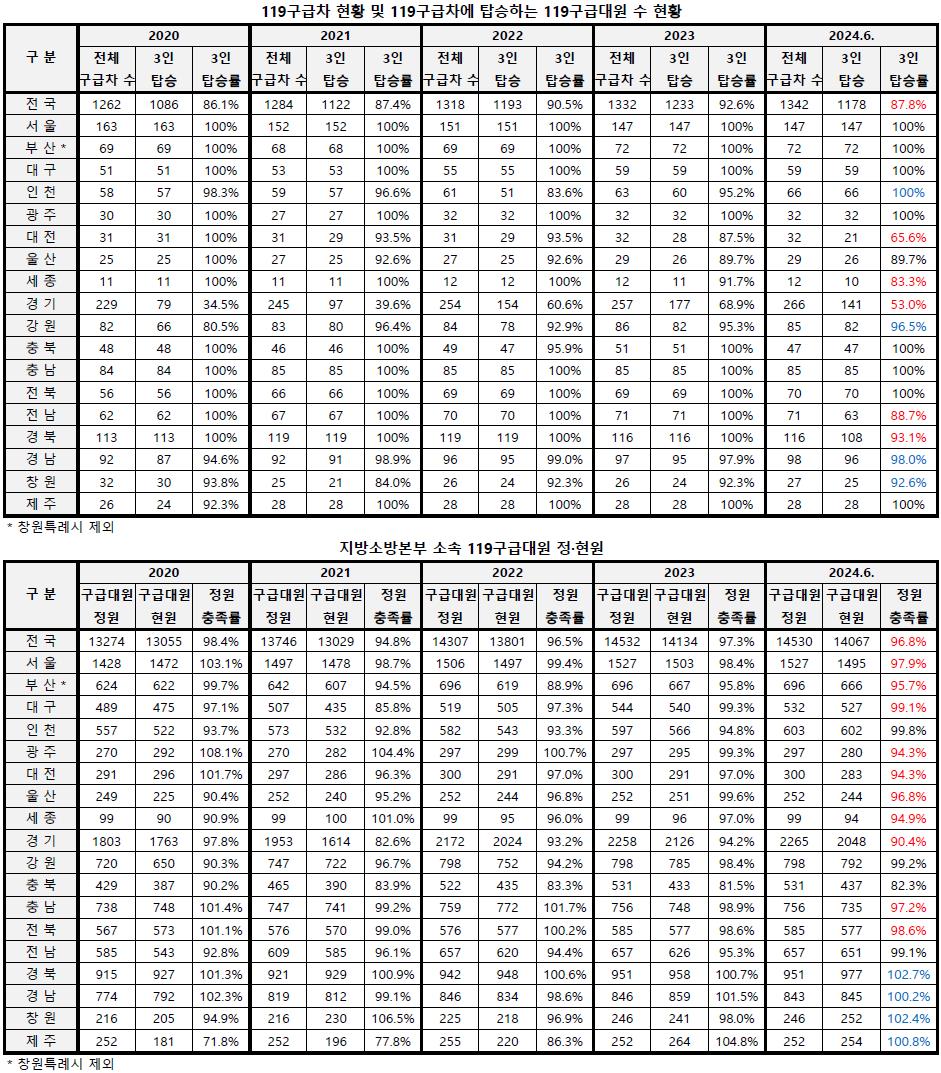 한풀 꺾인 구급차 3인 탑승률, 응급처치 ‘빨간불’ - 4년째 잘 상승하다가…올 상반기, 3년 전 수준으로 ‘풀썩’ - 3인 탑승률, 경기소방 53%, 대전소방 66%로 심각 김경순 기자 2024-10-11 22:24 가 본문내용 확대/축소 본문 한풀 꺾인 구급차 3인 탑승률, 응급처치 ‘빨간불’한풀 꺾인 구급차 3인 탑승률, 응급처치 ‘빨간불’ 위급상황 시 국민의 목숨을 책임지는 119구급차의 소방구급대원 3인 탑승률이 떨어지면서 응급환자의 생명을 구하는 데 비상이 걸렸다. 11일 국회 행정안전위원회 소속 더불어민주당 이상식(용인갑) 의원이 소방청으로부터 제공받은 자료에 따르면 구급차 3인 탑승률이 올 상반기 들어 꺾였다. 지난 6월말 기준 전국 구급차 88%(1천342대 가운데 1천178대)만 3인 탑승을 유지하고 있다. 3인 탑승률은 2020년 86%, 2021년 87%, 2022년 91%, 2023년 93%로 꾸준히 상승 곡선을 그리다 상반기에 고꾸라져 3년 전 수준으로 돌아간 것이다. 특히 경기소방은 3인 탑승률이 53%, 대전소방은 66%, 세종소방은 83%로 전국 평균보다 낮았다. 3인 탑승률은 지난 정부가 2022년까지 5년간 시행한 ‘소방대원 2만명 충원 계획’에 힘입어 꾸준히 늘어왔다. 소방대원 신규 채용은 2018년 5천671명, 2019년 5천387명, 2020년 4천691명, 2021년 4천461명, 2022년 3천814명이었다. 문제는 이후부터 신규 채용이 절반 이상 떨어져 지난해 1천560명, 올해 1천683명에 그쳤다. 증가하는 구급서비스 수요에 부응하지 못하고 있다는 우려의 목소리가 나오고 있다. 이에 구급대원의 정원 충족률도 덩달아 떨어져 구급차 3인 탑승률이 하락한 것으로 풀이된다. 2인 탑승제에 비해 3인 탑승제는 응급처치와 대응이 신속한 것은 물론 중증외상 환자나 심정지 환자 등의 소생률을 크게 향상시킬 수 있다. 경기남부소방 A소방서 소속 한 119안전센터에서 2인 탑승제로 활동하는 구급대원 B 소방교는 “심정지 환자 발생 시 한 명은 운전을 하기에 혼자서 의식·맥박·새츄레이션(산소포화도 측정)·동공반사 확인 등뿐만 아니라 심폐소생술을 하며 응급실까지 가야 한다”며 “시간이 지체될 뿐만 아니라 보호자에게 환자의 신상정보·병력 등을 물어서 병원에 전달할 겨를이 없다”고 하소연했다. 구급차 3인 탑승제 원칙은 유구하나 현실의 벽에 부딪혀 온전히 반영되지 못했다. 1996년부터 「소방력 기준에 관한 규칙」 ‘소방장비별 운전 및 조작요원 등의 배치기준’에 최초로 3인 탑승제 원칙이 명문화됐다. 하지만 광역지방자치단체 재정 형편에 따라 기준을 제대로 충족하지 못하는 곳이 많은 실정이다. 소방청은 3인 탑승률 하락이 특정 시기에 몰린 채용 인원의 출산전후휴가·육아휴직 등으로 인한 인력 공백 때문인 것으로 진단했다. 소방청 관계자는 “2022년까지 채용된 다수의 젊은 소방관들이 최근 출산전후휴가 및 육아휴직을 떠난 경우가 많다”며 “시·도에 별도 정원을 충원해달라고 요청은 하고 있는데, 크게 반영되고 있진 않은 모양”이라고 전했다. 이상식 의원은 “탑승률 저하가 고착화돼 하락세로 접어들기라도 하면 국민의 생명을 책임지는 구급·응급 체계에 큰 공백이 발생한다”며 “소방청은 국민의 생명이 위협받지 않도록 이번 현상에 대한 정확한 진단하고 분석해야 한다”고 밝혔다. 좋아요 0 싫어요 0 김경순 기자 기자의 다른기사 보기 목록 댓글목록 이전글 이상식 의원, 마약사건 관련 세관의 의심스러운 정황 폭로 24.10.11 다음글 용인특례시 평생학습관(수지), 특별 강좌 3개 수강생 모집 24.10.11