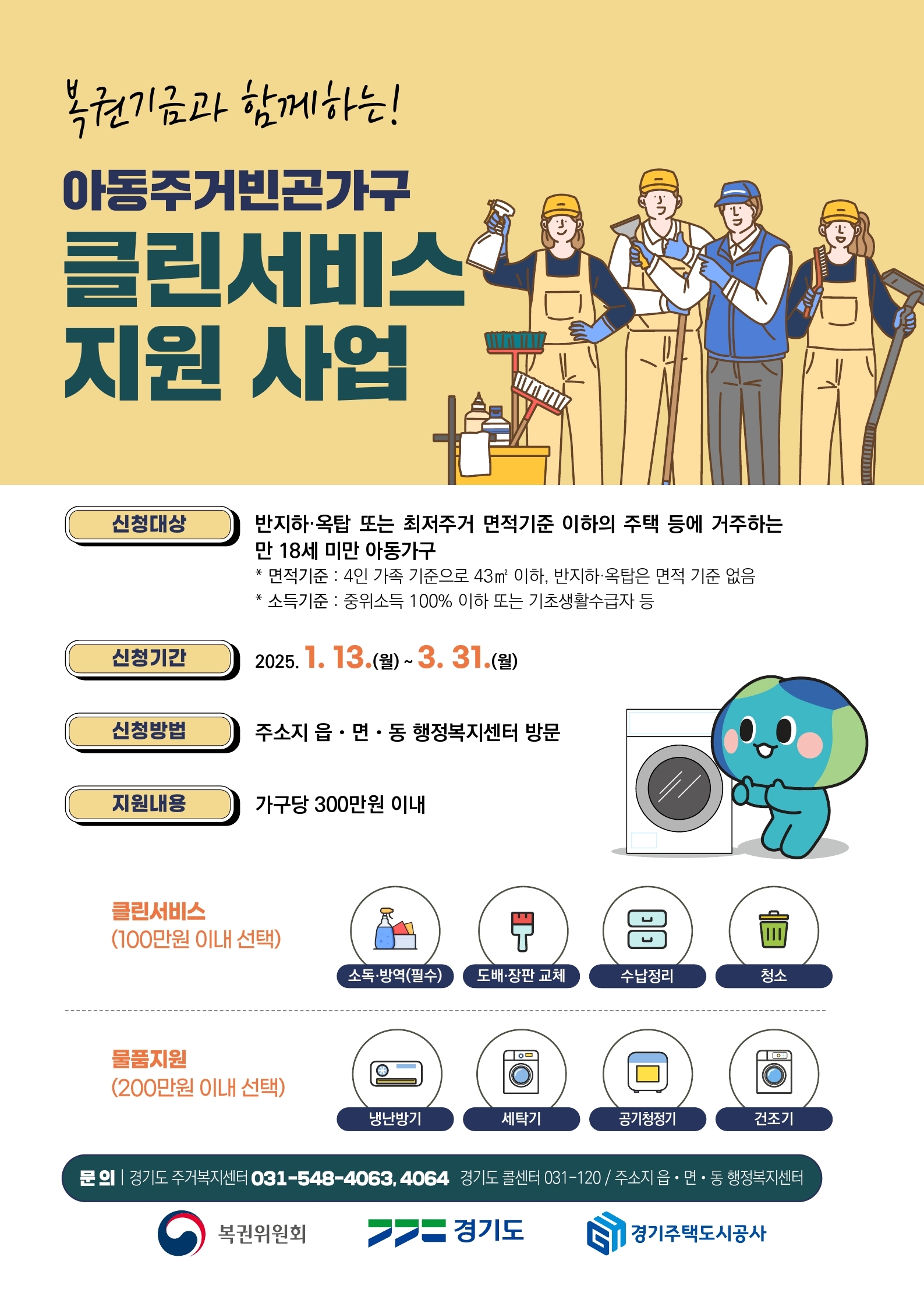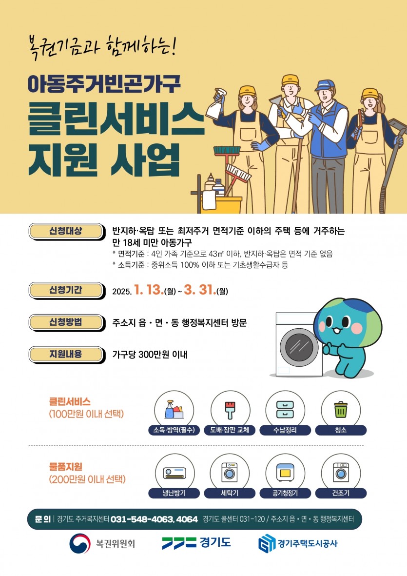 용인특례시, 소독‧방역 등 아동주거빈곤가구 클린 서비스 대상자 모집 - 3월 31일까지 읍‧면‧동 행정복지센터로…가구당 300만원 내에서 세탁기‧냉난방기 등 지원 김경순 기자 2025-01-31 16:05 가 본문내용 확대/축소 본문 용인특례시, 소독‧방역 등 아동주거빈곤가구 클린 서비스 대상자 모집 용인특례시(시장 이상일)는 아동을 둔 저소득 가구를 대상으로 주거환경과 위생개선을 지원하는 ‘복권 기금과 함께하는 아동주거빈곤가구 클린 서비스’ 사업대상자를 모집한다고 30일 밝혔다. 지원 대상은 18세 미만 아동(2007년 1월 2일 이후 출생)이 최저 주거 기준 미달(4인 가구 기준 43㎡ 미만) 주택이나 반지하·옥탑(건축물대장 상 표기)에 거주하는 가구다. 대상자로 선정되면 가구당 300만원 내에서 클린서비스(소독·방역, 장판 교체, 수납 정리, 청소)와 물품(냉난방기·세탁기·공기청정기·건조기)을 경기도 주거복지센터에서 지원할 예정이다. 용인특례시의 경우 지난해와 마찬가지로 올해 14가구가 지원받는다. 기준에 해당하는 가구는 38개 읍·면·동 행정복지센터로 오는 3월 31일까지 지원 신청을 하면 시가 적격 여부를 확인한 후 사업대상자를 선정한다. 시는 각 읍·면·동 행정복지센터를 비롯해 지역아동센터·어린이집 등에 해당 사업을 적극적으로 알려 대상자를 발굴할 방침이다. 자세한 내용은 시 홈페이지 고시 공고란을 참고하거나 시 공동주택과(031-6193-3384)로 문의하면 된다. 시 관계자는 “가정 형편이 어려운 아이들이 쾌적한 환경에서 건강하게 성장할 수 있도록 꾸준히 주거복지 향상에 힘쓰겠다”고 말했다. 좋아요 0 싫어요 0 김경순 기자 기자의 다른기사 보기 목록 댓글목록 이전글 용인특례시, 2025년 시민안전보험 갱신 25.02.03 다음글 용인특례시, 100세대 이상 대규모 건축물 앞으로 화재 예방시설 설치해야 25.01.31