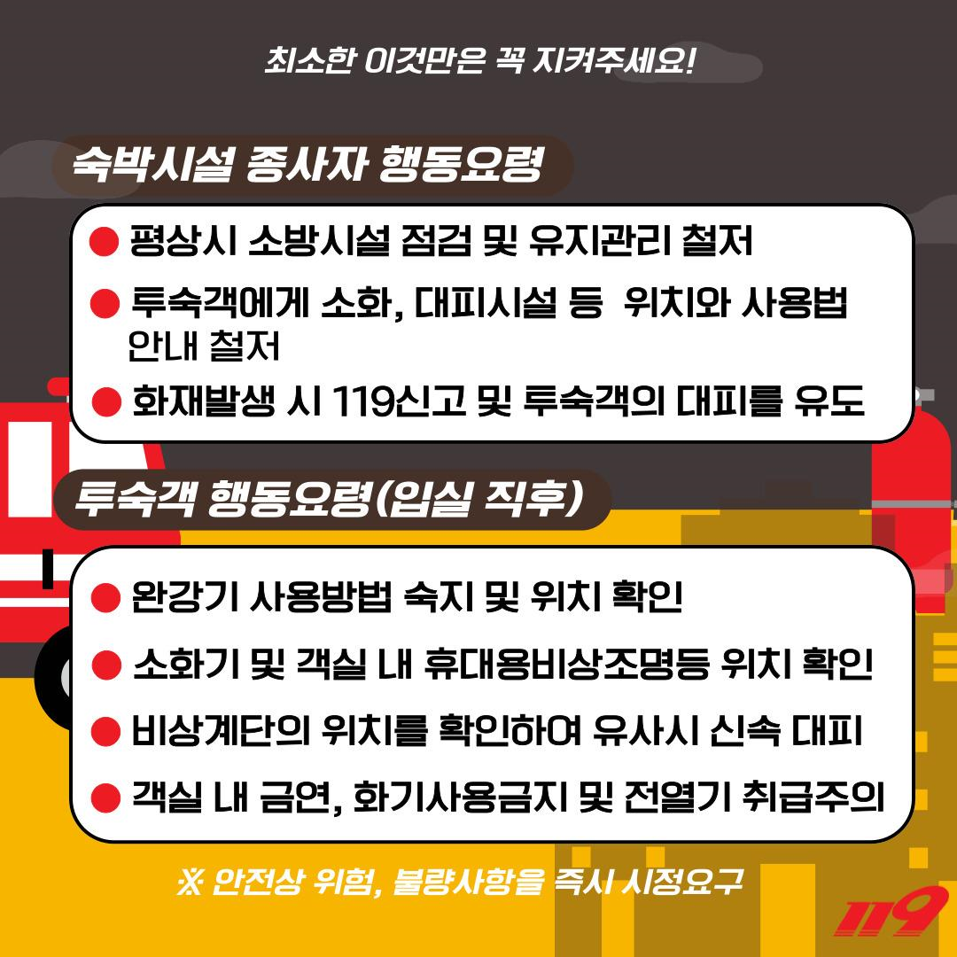 용인서부소방서, 숙박시설 화재 예방을 위한 안전점검 실시 김경순 기자 2025-02-03 18:43 가 본문내용 확대/축소 본문 용인서부소방서, 숙박시설 화재 예방을 위한 안전점검 실시 용인서부소방서(서장 장재구)는 숙박시설 화재 예방과 안전관리 강화를 위해 오는 4월까지 선제적인 안전점검을 추진한다. 이번 점검은 화재안전조사와 현장안전지도를 통해 진행되며, 용인시 기흥구와 수지구에 위치한 숙박시설 53곳을 대상으로 실시된다. 대형 인명피해가 우려되는 숙박시설 점검 과정에서 미흡 사항이 발견될 경우 가벼운 건은 현장에서 즉시 시정한다. 중대한 사안은 후속 조치 통해 지속 관리할 방침이다. 주요 내용으로는 ▲소방시설 및 피난시설 유지관리 확인 ▲방염물품 사용 여부 ▲투숙객의 피난행동요령 작성 지도 ▲피난 방화문의 적정성 및 옥상 출입문 개방 안전지도 등이다. 장재구 용인서부소방서장은 “불특정 다수가 이용하는 숙박시설의 특성상 화재발생시 큰 인명피해가 우려된다”며 “숙박시설 관계자는 화재 예방을 위해 반드시 안전수칙을 지켜주길 바란다”고 전했다. 좋아요 0 싫어요 0 김경순 기자 기자의 다른기사 보기 목록 댓글목록 이전글 용인특례시의회, 제290회 임시회…2월 10일부터 14일까지 25.02.03 다음글 연세대 용인세브란스병원, 개원 첫 간이식 수술 성공 25.02.03