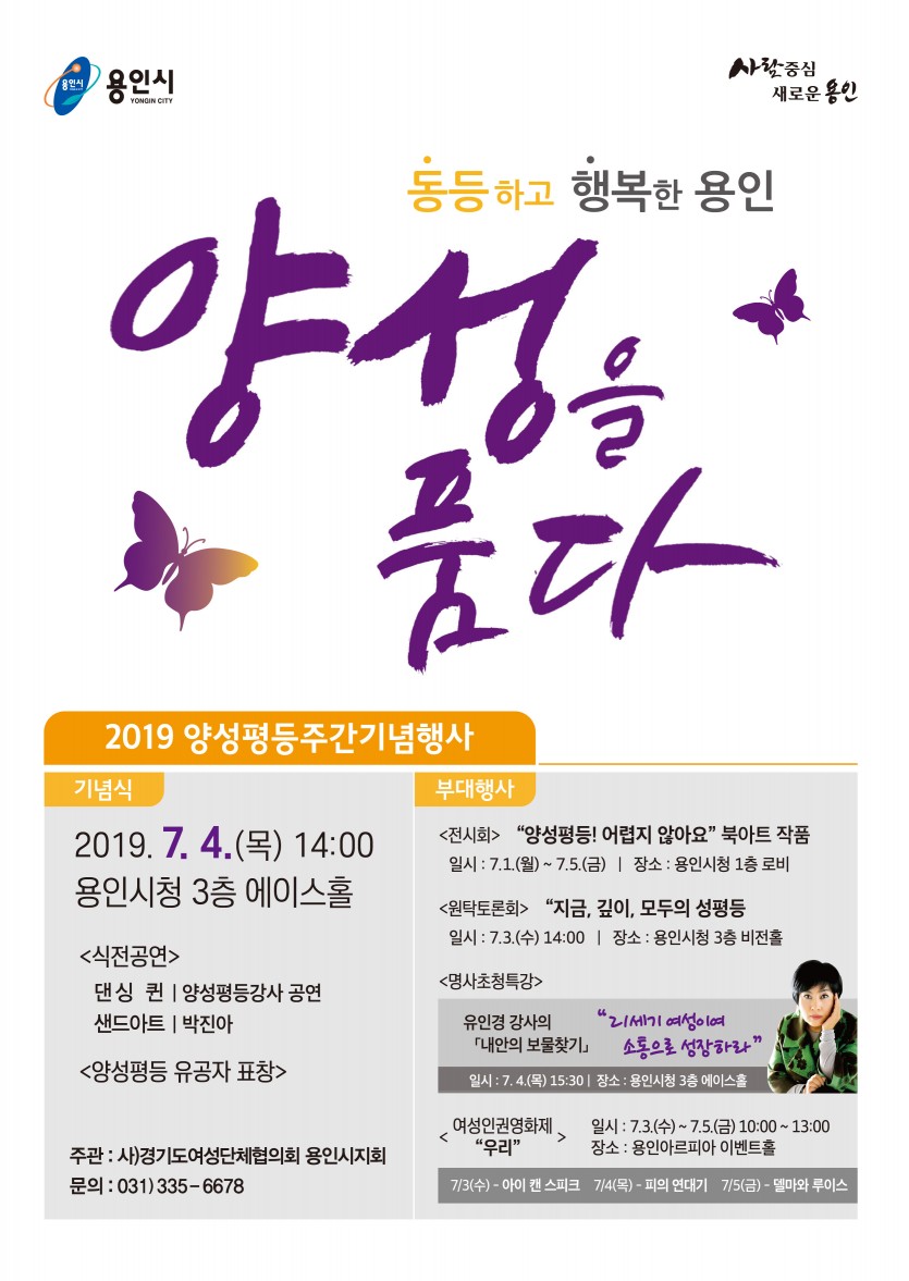 용인시, 양성평등주간 맞아 기념행사 개최 김경순 기자 2019-07-03 10:22 가 본문내용 확대/축소 본문 용인시, 양성평등주간 맞아 기념행사 개최 용인시는 1~7일 양성평등주간 동안 ‘함께한 100년 함께할 100년! 동등하고 행복한 용인!’을 주제로 기념식과 전시회, 명사 초청 특강 등 다양한 기념행사를 마련한다. 양성평등주간은 사회 전반의 분야에서 남녀평등을 실현하고자 제정된 것으로 이 기간 동안 성평등에 대한 올바른 이해과 공감대를 형성하기 위한 다채로운 행사가 시 곳곳서 열린다. (사)경기도여성단체협의회 용인시지회가 주관하는 기념식은 4일 시청 에이스홀에서 백군기 용인시장을 비롯한 지역주요인사와 여성단체회원, 시민 등 500여명이 참여한 가운데 열릴 예정이다. 이날 기념식에선 양성평등 촉진과 여성의 권익증진 ‧ 사회참여 등에 기여한 유공자를 시상하고 방송인 유인경씨가 ‘내안의 보물찾기 - 21세기 여성이여, 소통으로 성장하라’를 주제로 특강을 한다. 1~5일 시청 1층 로비에선 지역아동센터 어린이들과 시민들이 참여한 양성평등 북아트 전시회가 마련되고, 3~5일 용인아르피아에선 여성인권영화제가 열린다. 이 자리에선 여성인권을 다룬 영화 ‘피의 연대기’를 상영하고, 김보람 감독이 시민과 대화의 시간을 가질 방침이다. 3일 시청 비전홀에선 시민들이 참여하는 양성평등 원탁토론회가 열려 청년 ‧ 장애인 ‧ 노인 등 각계각층의 성평등 이슈에 대해 논의하고, 2일과 4일엔 57탄약대대 병사 250여명을 대상으로 찾아가는 양성평등 교육도 진행할 예정이다. 백 시장은 “전시 ‧ 강연 ‧ 토론 등 다양한 프로그램을 통해 진정한 양성평등의 의미를 되새기고자 마련한 행사”라며 “성역할의 구분없이 누구나 마음껏 일하고 행복한 삶을 누릴 수 있는 평등한 사회를 만들도록 노력할 것”이라고 말했다. 좋아요 0 싫어요 0 김경순 기자 기자의 다른기사 보기 목록 댓글목록 이전글 맞벌이 가정 초등생 돌봄교실 참가자 모집 19.07.03 다음글 백군기 시장, 정규직 전환 공무직 근로자에 임명장 19.07.01