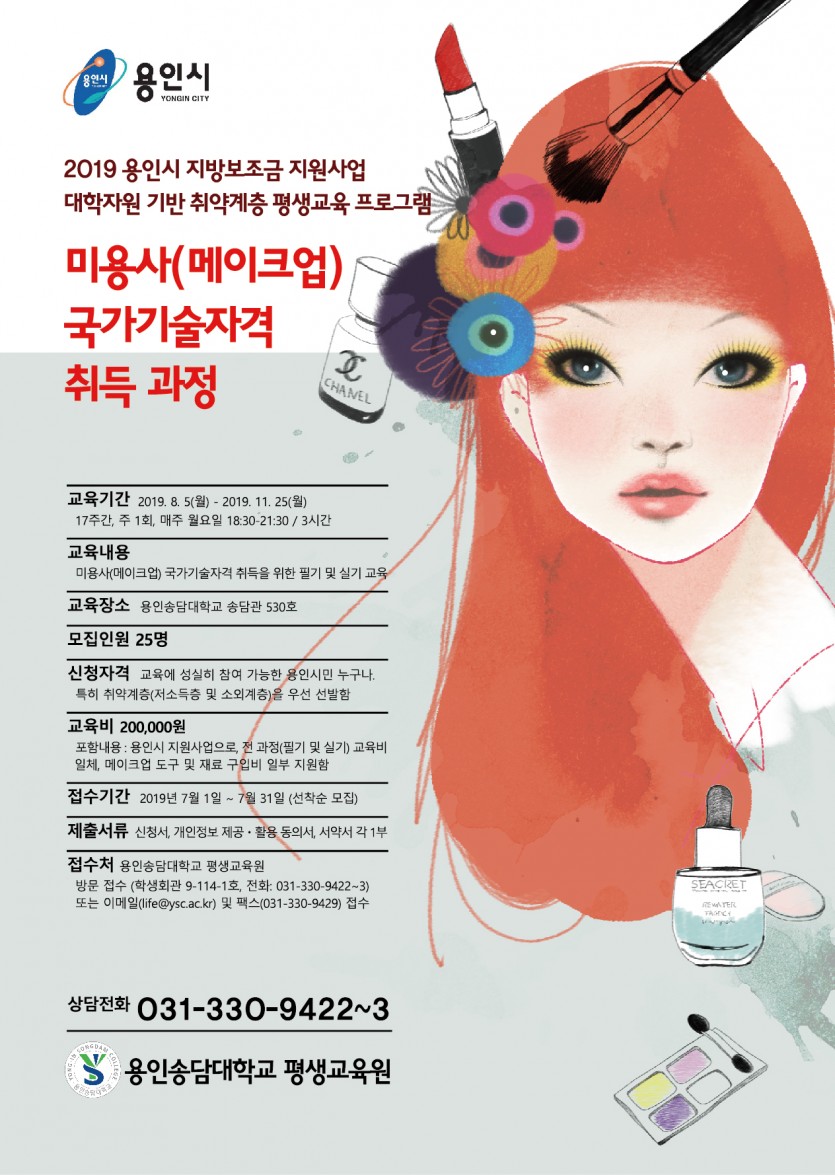 취약계층 대상 미용사 자격 취득과정 수강생 모집 용인시, 관내 대학 공모로 프로그램 선정…교육비 일부 지원 김경순 기진 2019-07-27 01:04 가 본문내용 확대/축소 본문 취약계층 대상 미용사 자격 취득과정 수강생 모집 용인시는 취약계층 등을 대상으로 하는 용인송담대 평생교육원 미용사(메이크업) 국자기술자격 취득과정 참가자를 모집한다고 26일 밝혔다. 경제적 자립이 필요한 취약계층에 국가자격기술을 배울 수 있는 기회를 제공해 취업 기반을 마련해주기 위해서다. 참가자들은 8월5일부터 11월25일까지 미용사(메이크업) 국가기술자격 취득을 목표로 필기와 실기시험에 대비한 수업을 받게 된다. 시가 교육비와 재료비의 일부를 지원해 참가자는 20만원을 자부담 하면 된다. 참여를 원하는 사람은 31일까지 용인 송담대(031-330-9422~3)으로 전화 신청 하면 된다. 선착순 25명을 모집하는데 취약계층을 우선 선발한다. 앞서 시는 관내 대학을 대상으로 취약계층에 평생교육 기회를 제공하는 프로그램 공모를 했다. 이 공모로 송담대 평생교육원 미용사 자격과정을 비롯해 용인대 평생교육원(어르신 뷰티‧헬스케어), 강남대 평생교육원(취약계층 치매예방교육) 등 3개 대학의 교육과정을 선정했다. 시 관계자는 “관내 대학의 다양한 교육 인프라를 활용해 취약계층에게 꼭 필요한 프로그램을 제공해 나갈 것”이라고 말했다. 좋아요 0 싫어요 0 김경순 기진 기자의 다른기사 보기 목록 댓글목록 이전글 용인시, 시 약사회가 취약계층 어르신에 실버카 30대 전달 19.08.02 다음글 명문 국제화 대안학교 ‘해인스쿨’과 용인 함지(대표 이국상)와 Clearview Campus Yong-in 공동사업 협약식 가져 19.07.25