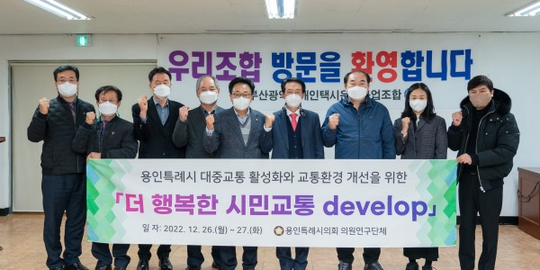 용인특례시의회 의원연구단체 「더 행복한 시민교통 develop」(대표 김영식)는 지난 26일부터 27일까지 1박 2일 동안 부산광역시 교통환경 시스템 벤치마킹을 실시했다. 이번 벤치마킹은 현장방문을 통해 교통관리 시스템 성공사례를 수집하는 등 용인시 대중교통 활성화와 교통환경 개선을 위해 추진하게 됐다. 주요 일정으로는 부산광역시 택시운송조합을 방문해 부산의 택시 현황에 대해 청취하고, 택시 회원 조합원으로 된 단…