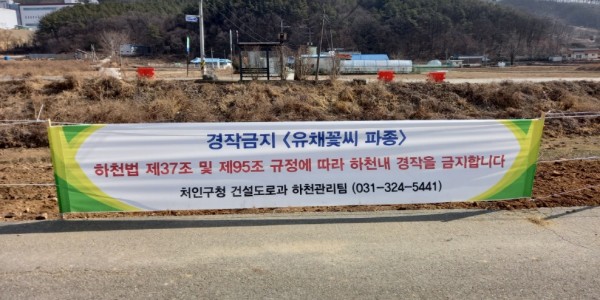 용인시 처인구는 오는 6월까지 관내 하천구역 내 불법경작 행위를 집중 단속키로 했다고 밝혔다. 시민들이 산책로로 이용하는 하천 내 불법경작 등으로 악취・쓰레기 관련 민원이 급증한 데 따른 것이다. 이를 위해 구는 앞선 1월부터 2월초까지 경안천(모현~포곡)과 완장천(납사읍)을 대상으로 일제 조사를 진행해 완장천 일대 불법경작지 20곳을 적발했다. 구는 적발된 완장천 불법경작지에 대해 원상복구 조치한 후 유채꽃…