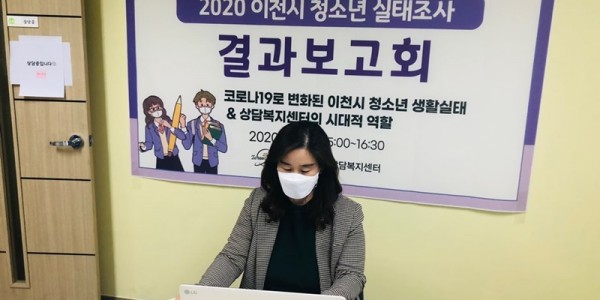 (재)이천시청소년재단 이천시청소년상담복지센터에서는 금일(22일) 코로나19 장기화에 따른 이천시 청소년들의 일상생활 변화에 대한 실태조사를 실시하고, 실태조사 연구결과를 기반으로 ‘청소년상담복지센터의 시대적 역할의 방향성’을 제시하고자 온라인 결과보고회를 개최하였다.▲온라인 결과보고회 행사 진행 사진(김유정 센터장)이번 온라인 실태조사 결과보고회는 당초 예정되었던 대면 행사에서 코로나19 방역단계 격상에 따라 화상회…