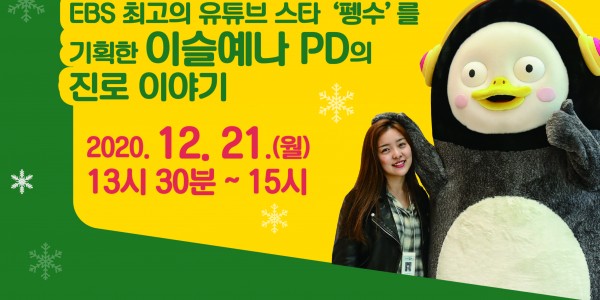 용인시 기흥도서관이 오는 21일 온라인 진로 멘토링 ‘랜선 드림톡’을 운영한다고 14일 밝혔다. ‘랜선 드림톡’은 진로를 고민하고 있는 청소년들을 위해 마련, EBS 의 '펭수'를 기획·제작한 이슬예나 PD가 강사로 참여해 진로 설계와 방향에 대해 조언하는 시간을 갖는다. 이 PD는 올해 제32회 한국PD대상 ‘올해의 PD상’, 대한민국 콘텐츠 대상 ‘캐릭터 부문 대통령상’ 등을 수상한 바 있다. 이 PD는…