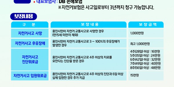 용인시민 임 모씨는 2019년 5월 처인구 김량장동에서 자전거사고로 골절을 입어 12주 진단을 받고 입원 치료를 받았다. 임씨는 척추 손상을 입고 30% 장애 진단을 받아 용인시 자전거보험에서 405만원을 지급 받았다. 시민 이 모씨는 2019년 10월 처인구 김량장동에서 자전거를 타고 가다 차량과 충돌하여 사망했다. 이 모씨의 자녀들은 용인시 자전거보험이 있다는 사실을 알고 보험금을 신청해 1350만원을 지급 받았다. …