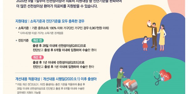 용인시보건소는 11일 선천성이상아 의료비 지원 기준을 출생 후 28일 이내에서 출생 후 1년까지로 확대해 지원한다고 밝혔다. 기존에는 선천성이상아 의료비 지원이 출생 후 28일 이내에 선천성이상(Q코드)으로 진단받고 출생 후 6개월 이내에 입원해 수술한 환아에 한했다. 이에 2020년9월1일 출생아부터는 출생 후 1년 이내에 선천성이상(Q코드)으로 진단 받고 입원해 수술한 환아로 지원대상이 확대 적용된다. …