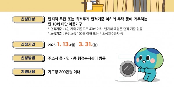용인특례시(시장 이상일)는 아동을 둔 저소득 가구를 대상으로 주거환경과 위생개선을 지원하는 ‘복권 기금과 함께하는 아동주거빈곤가구 클린 서비스’ 사업대상자를 모집한다고 30일 밝혔다. 지원 대상은 18세 미만 아동(2007년 1월 2일 이후 출생)이 최저 주거 기준 미달(4인 가구 기준 43㎡ 미만) 주택이나 반지하·옥탑(건축물대장 상 표기)에 거주하는 가구다. 대상자로 선정되면 가구당 300만원 내에서 클린서비스(…