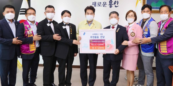 용인시는 24일 김의겸 국제라이온스협회 총재와 임직원들이 시를 방문해 수해 복구에 애쓰는 봉사자들에게 전해달라며 500만원 상당의 마스크와 생수를 기탁했다고 밝혔다. 김의겸 총재는 “집중호우로 피해를 입은 원삼과 백암지역의 수해 복구를 위해 많은 자원봉사자들이 구슬땀을 흘리며 노력하고 있어 조금이나마 도움이 되었으면 하는 마음으로 회원들과 마련한 물품”이라고 말했다. 백군기 용인시장은 “어려운 시기에 국제라이온스협회…