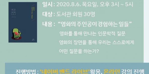용인시 도서관은 시민들의 인문학 감수성을 자극하기 위한 온라인 영화 인문학 강의에 참가할 시민 30명을 모집한다고 밝혔다. 8월6일 진행되는 첫 강의는 ‘영화가 나에게 하는 질문들’의 저자 원은정 작가가 ‘영화의 주인공이 경험하는 일들’을 주제로 영화를 통해 만나는 인문학적 질문들에 대해 진행한다. 참가를 원하는 도서관 회원은 30일부터 도서관 홈페이지(lib.yongin.go.kr) 문화행사 코너에서 선착순으로 신…