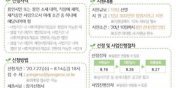 용인시는 22일부터 8월14일까지 지역 사회문제 해결에 기여하는 사회적경제 기업가 육성사업에 참여할 창업팀을 모집한다. 사회적기업은 지역사회 공헌으로 주민의 삶의 질을 높이는 등 사회적 목적 실현을 위해 설립된 기업으로 주로 취약계층에게 일자리나 사회서비스를 제공하고 사회통합, 사회서비스 제공 등을 한다. 시는 10팀을 선발해 각 팀마다 300만원씩의 창업지원금과 실질적인 창업을 위한 컨설팅 ‧ 교육 등을 지원한다…