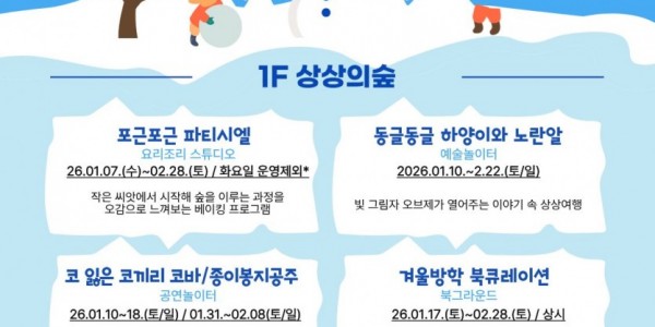 용인문화재단(이사장 이상일)은 2026년 겨울방학을 맞아 복합문화공간 용인어린이상상의숲과 용인문화도시플랫폼 공생광장에서 아이들과 가족이 함께 즐길 수 있는 다양한 신규 콘텐츠를 선보인다. 이번 겨울방학 프로그램은 어린이의 감각과 창의력, 상상력을 자극하는 체험 중심 콘텐츠로 구성돼 방학 기간 가족 단위 방문객들에게 풍성한 문화 경험을 제공할 예정이다. ■ 용인어린이상상의숲, 체험·놀이·공연으로 만나는 겨울방학 용인…
