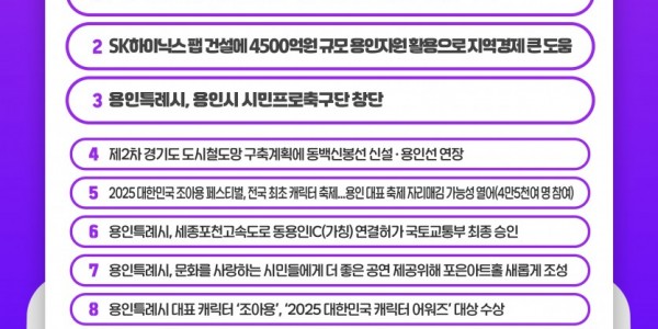 2025년 용인특례시(시장 이상일)를 빛낸 최고의 뉴스로 '반도체 투자규모 1000조 원에 육박'이 뽑혔다. 'SK하이닉스 팹 건설에 4500억 원 규모 용인 지역자원 활용’과 '용인시 시민프로축구단 창단'이 각각 2위, 3위를 차지했다. 시는 지난 16일부터 22일까지 일주일간 시민과 공직자, 언론인을 대상으로 올해 주요 뉴스를 선정하는 온라인 설문조사를 했다. &nb…