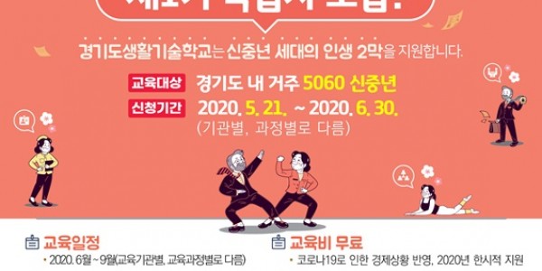 경기도가 도내 중장년층에게 생활기술교육을 무상으로 제공하는 ‘경기도생활기술학교’ 교육생을 모집한다.도는 2017년부터 도내 5060 신중년 세대의 근로를 통한 경제적 노후준비 및 지속적 사회 참여 기회 제공을 위해 소양교육, 생활기술교육, 사회봉사연계 현장실습, 취·창업을 지원하는 ‘경기도생활기술학교’를 운영하고 있다.2020년 경기도생활기술학교 교육기관으로는 가천대, 청강문화산업대, 대진대 등 22개 평생교육기관이 공모를 통…