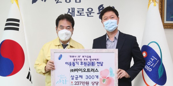 용인시는 18일 안산시 소재 살균장치 제조업체 바이오트러스가 코로나19로 어려움을 겪고 있는 이웃에 전해달라며 237만원 상당의 살균제 300개를 기탁했다고 밝혔다. 추용 바이오트러스 대표는 “코로나19로 더 어려워진 이웃에게 조금이나마 도움이 되길 바라는 마음으로 살균제를 기탁했다”라고 말했다. 백군기 용인시장은 “코로나19 위기로 어려운 상황임에도 불구하고 용인시민들을 위해 성품을 기부해줘 감사하다”라고 말했다…