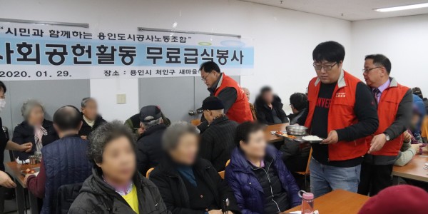 용인도시공사 노동조합은 29일 오전 11시 처인구 마평동 새마을 무료 급식소를 찾아 지역 내 소외계층을 초청하여 설맞이 떡국을 대접하는 급식 봉사를 실시했다. 이날 행사는 같은 날 오후에 열린 2020년 조합 정기총회를 앞두고, 지역 내 공공기관 노동조합으로서 사회공헌의 일환으로 행사를 가졌다. 장용찬 위원장 등을 비롯한 노조 간부와 대의원들은 솔선수범해 떡국을 배식하고, 어르신들에게 새해 덕담을 건네며 건강을 기…