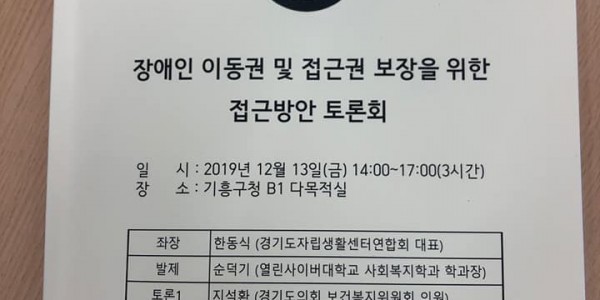 용인시장애인자립생활센터는 2019년 12월 13일 기흥구청에서 장애인 이동권 및 접근권보장을 위한 접근방향 이란 주제로 용인시 기흥구청 다목적실에서 토론회를 진행 하였다 용인시장애인자립생활센터 김정태사무국장은 이번 토론회는 예전에 비해 개선은 되었다고는 하나 여전히 장애인들의 이동권과 접근권은 장애인들이나 이동약자들에게 사회적 단절을 가져오는 걸림돌로 작용되고 있으며 장애인 이동권을 이야기 할 때 대부분의 자치단체는 교통약자…