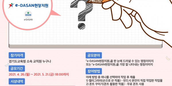 경기도교육청(교육감 이재정)은 26일부터 5월 21일까지 온라인 업무지원시스템 ‘e-DASAN현장지원’의 새로운 상징(CI)을 공모한다. ‘e-DASAN현장지원’은 도내 교직원에게 교무학사, 행정, 일반 업무관련 통합검색, 질문·답변, 신규길라잡이 서비스를 제공하는 온라인 업무지원시…