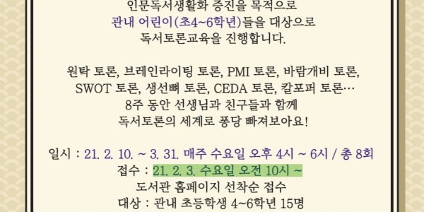 용인시 도서관은 3일부터 선착순으로 ‘어린이 첫 독서토론모임’ 의 참가자를 모집한다고 1일 밝혔다. 오는 10일부터 다음달 31일까지 매주 수요일 8회에 걸쳐 진행되는 독서토론모임은 토론의 필요성, 적극적인 의사소통, 합리적인 대안 제시, 비판적 사고 함양 등 토론에 필요한 기술을…