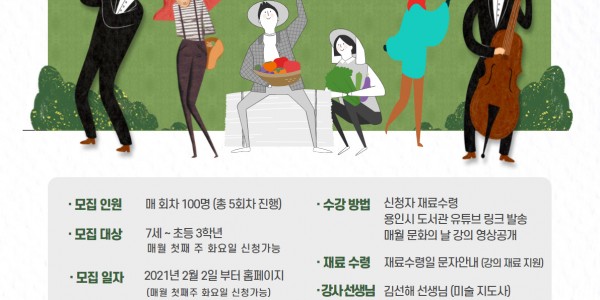용인중앙도서관은 코로나19로 지친 아이들을 위한 온라인 프로그램 ‘아트 감수성 UP 프로젝트-책 속 예술여행’을 운영한다고 31일 밝혔다. 2월부터 6월까지 매월 마지막 주 수요일 문화가 있는 날에 진행될 책 속 예술여행은 코로나19로 지친 아이들에게 책과 함께 다양한 예술 장르…