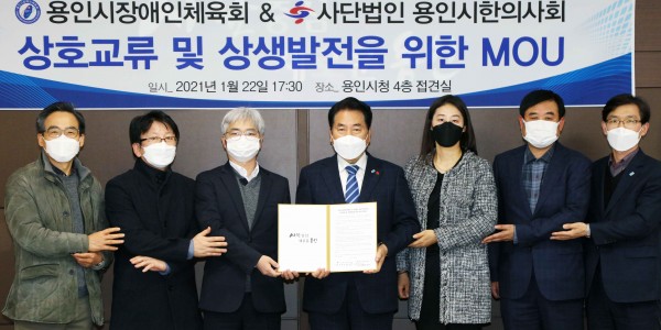 용인시는 22일 용인시장애인체육회와 (사)용인시한의사회가 체육회원들의 건강증진과 생활체육 활성화를 위한 업무 협약을 맺었다고 밝혔다. 시청 접견실에서 열린 이날 협약식엔 용인시장애인체육회 회장인 백군기 용인시장과 황재형 (사)용인시한의사회장 등 관계자 3명이 참석했다. 협약…