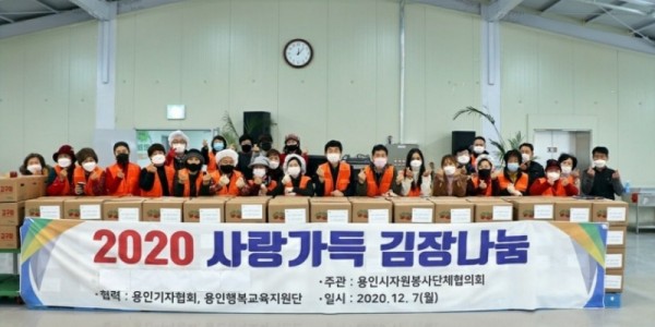 용인시자원봉사단체협의회(회장 이규수)는 7일 용인기자협회(회장 최재은), 용인행복교육지원단(회장 신현녀)과 협력하여, 처인구의 남사농원에서 ‘2020 사랑가득 김장나눔’ 행사를 진행했다고 밝혔다. 이번 김장나눔 행사는 GH 경기주택도시공사가 지역사회 취약계…