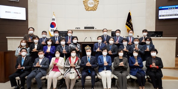 용인시의회(의장 이건한)는 27일 본회의장에서 코로나19 극복을 위해 헌신하는 의료진에게 감사와 응원의 메시지를 전달하는 ‘덕분에 챌린지’에 동참했다. 이날 이건한 의장과 남홍숙 부의장 등 의원들이 참석한 가운데 덕분에 챌린지 수어 동작을 하며 의료진에게 존경과 감사의 메시지를 전…