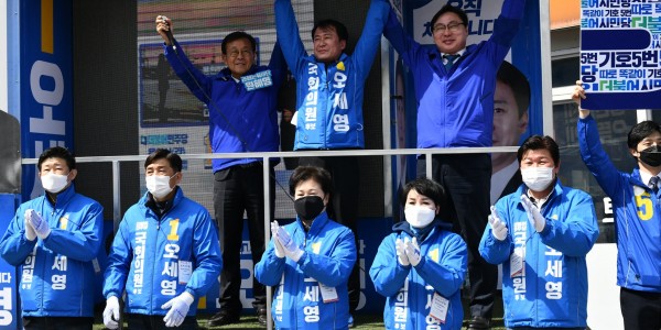 오세영 더불어민주당 용인시갑 국회의원 후보를 지원하기 위하여 12일 ‘라떼는! 유세단장’ 원혜영 의원과 ‘국민지킴유세본부장’ 이화영 전 의원이 명지대사거리 앞에서 함께 합동 유세를 진행했다. 오세영 후보는 “힘 있는 집권여당 후보로써 경강선과 부발선 예비타당성 조사 면제로 처인 철도 시…
