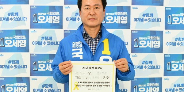 □ 오세영 더불어민주당 용인시갑 국회의원 후보가 13일 4.16연대에서 주관하는 ‘세월호 참사 5대 정책과제 약속운동’에 동참하여, 성역 없는 진상규명과 안전한 사회 만들기에 함께할 것을 약속했다고 밝혔다. □ 5대 정책과제는 ▲세월호 참사 관련 대통령 기록물 공개 ▲ 세월호 참사…