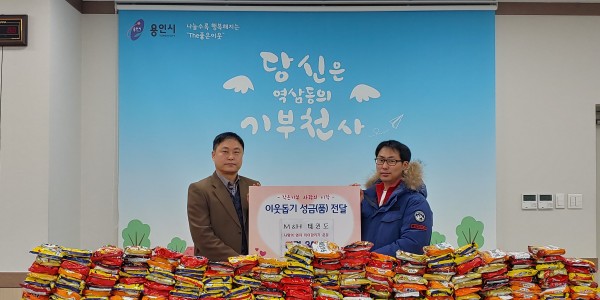 용인시는 29일 관내 태권도장 2곳의 원생들이 어려운 이웃을 돕는데 써 달라며‘사랑의 열차 이어달리기’에 라면 1천여개를 기탁했다고 밝혔다. 이날 역삼동 용인대석사 M&H태권점핑클럽 안택훈 관장은 주민센터를 찾아와 원생들과 함께 모은 라면 346개를 전달했다. 안 관장은 “원…