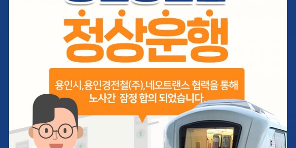 용인시는 30일 용인경전철 노조가 이날부터 이틀간 예정했던 파업을 철회함에 따라 경전철이 시민불편 없이 정상 운행된다고 밝혔다. 이와 관련 용인경전철 운영사인 네오트랜스(주)와 경전철 노조는 29일 오후 2시부터 경전철 차량기지 회의실에서 철야 협상에 들어가 5차례에 걸친 교섭 끝…
