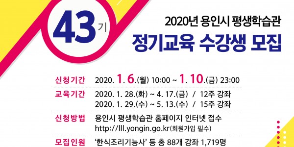 용인시는 수지구 풍덕천동 평생학습관에서 내년 1월28일부터 4월17일까지 운영하는 정기교육의 수강생 1719명을 1월6~10일 모집한다. 강좌는 7개분야 88강좌로 구성됐다. 한식조리기능사 등 조리분야 21강좌를 비롯해 헤어뷰티분야 6강좌, 양장기능사 등 기술실용분야 11강좌, 영…