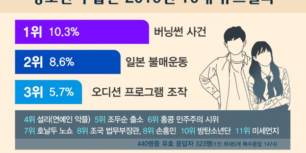 경기도교육청(교육감 이재정)이 21일 수원 화홍고등학교에서 열린 도교육청 청소년방송 ‘미디어경청’ 송년 콘서트에서 ‘청소년이 뽑은 2019년 10대 뉴스’조사 결과를 발표했다. 조사결과 1위는 10.3%를 얻은 ‘버닝썬 사건’이 차지했다. 2위는 ‘일본 불매운동’으로 8.6%, 3위…