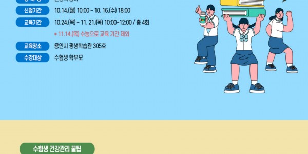용인특례시(시장 이상일) 평생학습관은 10~11월 4주 과정으로 운영하는 특별 교육 과정 3개를 개설해 오는 14일부터 수강생을 모집한다. 이번에 개설된 강좌는 ‘수능 수험생 건강관리 꿀팁’ 2개 과정과 ‘스마트폰으로 즐기는 디지털 라이프(기초편)’ 등 3개 과정이다. 수능 …