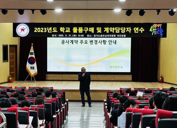 용인교육지원청(교육장 강원하)은 3월 21일부터 22일까지 관내 공립 단설 유치원·초·중·고 행정실장 및 계약담당자 182명을 대상으로 학교시설 공사 역량 강화 연수 등을 실시한다. 이번 연수는 단위학교 시설공사 계약 및 기술지원 등 분야별 현장 지원으로 시설공사의 전문성 및 책무성을 강화하고 지역산업을 활성화하기 위하여 진행한다. 주요 연수내용으로는 ▲ 2023년 공사 계약 주요변경 사항 ▲ 공사계약 …