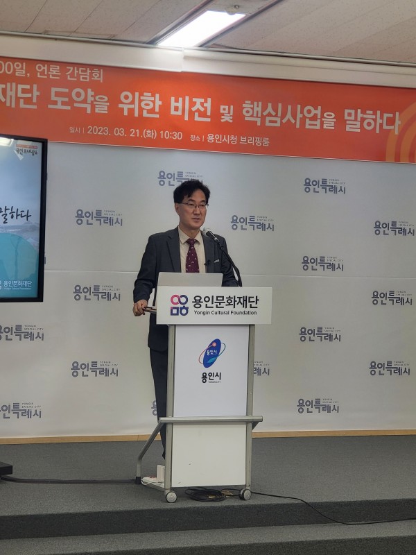 (재)용인문화재단 김혁수 대표이사가 21일 시청 브리핑룸에서 재단 취임 100일을 맞아 언론브리핑을 열고 재단의 운영 방향과 비전을 발표했다. 김 대표는 지난 12월 취임 이후 재단에 대한 대내외 부정적인 인식과 평가 개선을 위해 조직 내 소통 문화 개선을 지속적으로 강조했다. 조직문화 개선을 위한 첫 번째 과제로 문화재단으로서의 역할을 강조하고 조직 구성원 다수가 공감하는 비전을 수립하기 위해 올 초 임직원 인터…