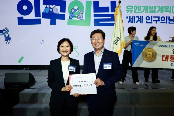 이상일 용인특례시장이 복지서비스 분야 제도개선 방안을 보건복지부에 건의했다. 이상일 시장은 지난 11일 서울 JW매리어트 호텔에서 열린 ‘제14회 인구의 날 기념식’에서 이스란 보건복지부 제1차관에게 어르신 돌봄 서비스 종사자인 요양보호사에 대한 장기근속장려금 인상, 아동돌봄센터 기준 변경, 보건복지부 소관 사회복무요원 인건비의 지방자치단체 부담 철회 등의 의견을 담은 건의문을 전달했다. 보건복지부가 주최한 ‘제…