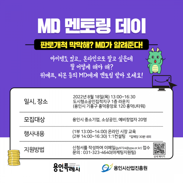 용인시산업진흥원(원장 김윤석, 이하 진흥원)은 용인 기업과 소상공인의 온라인 시장 진출 역량 강화를 위한 ‘MD 멘토링 데이’에 참여할 관내 중소기업·소상공인·예비창업자 등을 오는 11일(목)까지 모집한다. ‘MD 멘토링 데이’는 온라인 유통사(위메프·티몬) MD가 참여하여 관내 중소기업·소상공인·예비창업자를 대상으로 온라인 마케팅 교육 및 컨설팅을 진행하는 멘토링 프로그램으로 오는 18일 용인시 기흥구 흥덕U타워 소공…