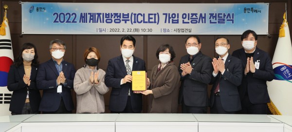 용인시가 22일 친환경 생태도시의 국제적 위상 확보를 위해 추진해 온 이클레이(ICLEI, 세계지방정부협의회) 공식 가입 인증서를 전달받고 정식 회원으로 활동을 시작한다. 이날 시장실에서 열린 인증서 전달식에는 백군기 용인시장, 박연희 이클레이 한국사무소장, 손봉희 이클레이 한국사무소 사무국장 등 8명이 참석했다. 박연희 이클레이 한국사무소장은 "효과적인 기후변화 대응을 위해선 실생활과 밀접한 지방정부의 역할이 막중…