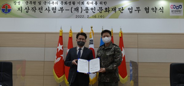 (재)용인문화재단과 지상작전사령부는 장병·군무원 등 군인가족과 용인시민의 문화복지 증진 및 문화예술 발전에 기여하기 위한 업무협약을 지난 16일 오후 2시 지상작전사령부 대회의실에서 체결했다. 이번 협약식을 통해 양 기관은 유기적인 업무협력체계를 구축하여 문화예술분야의 상호발전을 위한 활동에 협력하기로 했다. 협약서는 정길배 용인문화재단 대표이사와 지상작전사령부 인사참모부장 류승민 준장이 양 기관을 대표하여 서명했다. …