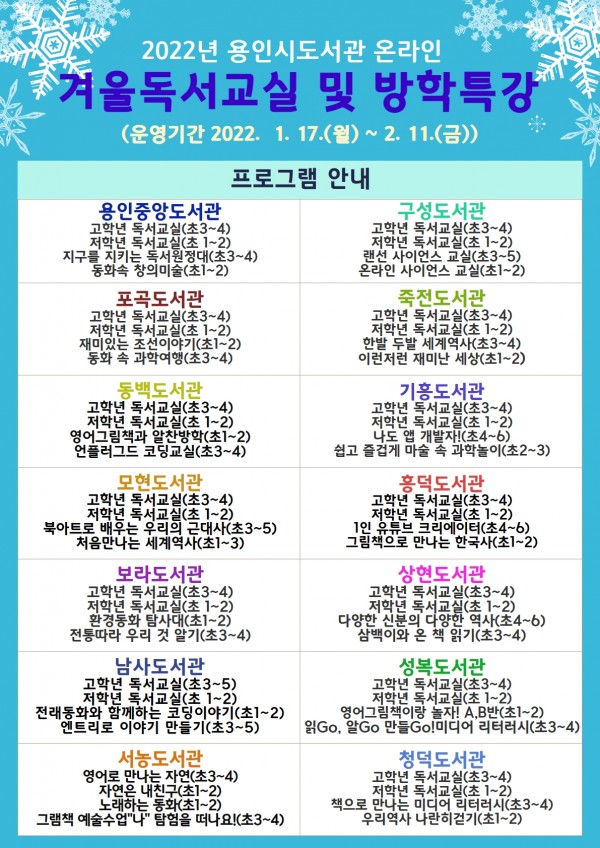 용인시 도서관사업소가 겨울방학을 맞은 어린이들을 위한 ‘2022년 온라인 겨울독서교실 및 방학특강’을 준비했다. 화상회의 앱인 줌(ZOOM)과 웨일온(Whale ON) 등으로 내년 1월 17일부터 2월 11일까지 진행하는 이번 프로그램은 코로나19로 바깥 활동이 어려운 아이들에게 책과 친해질 수 있는 기회를 제공하기 위해 용인중앙, 포곡, 동백, 보라, 구성, 죽전, 기흥, 상현 등 관내 14개 도서관이 기획했다. …