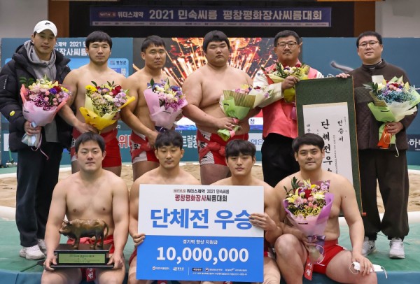 용인시청이 221년 11월 20일(토)부터 24일(수)까지 5일간 강원도 평창군에서 개최된 ‘위더스제약 2021 민속씨름 평창평화씨름대회’에서 단체전 첫 우승과 함께 백두장사를 배출하며 대회를 성황리에 마무리했다. 장덕제 감독ㆍ우형원 코치가 이끄는 용인시청은 마지막날 단체전 결승전에서 충남 태안군청을 4대1로 완파하고 패권을 차지했다. 장덕제 감독은 “ 그동안 단체전 우승과는 거리가 멀었는데 처음으로 우승해 너무 기…