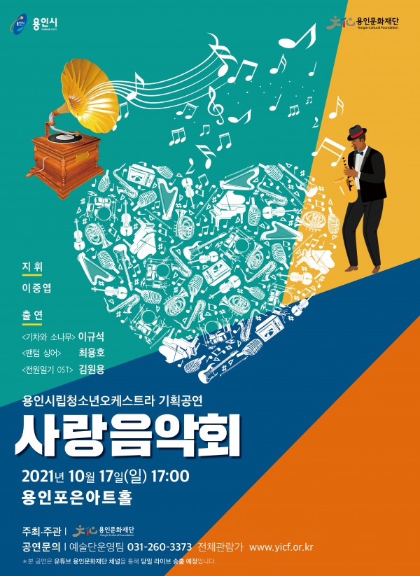 (재)용인문화재단(이사장 백군기)은 용인시립청소년오케스트라 기획공연 ‘사랑음악회’를 오는 1 17일 오후 5시 용인포은아트홀에서 개최한다. 이번 공연은 가요, 클래식 등 다양한 장르의 음악과 즐거운 볼거리가 가득한 프로그램으로 준비되었다. 또한, 의 가수 이규석와 성악가 최용호, 국내 최고 색소포니스트 김원용의 협연으로 공연의 재미를 더할 예정이다. 전체관람가로 진행되는 이번 공연은 오는 13일 12시부터 15일…