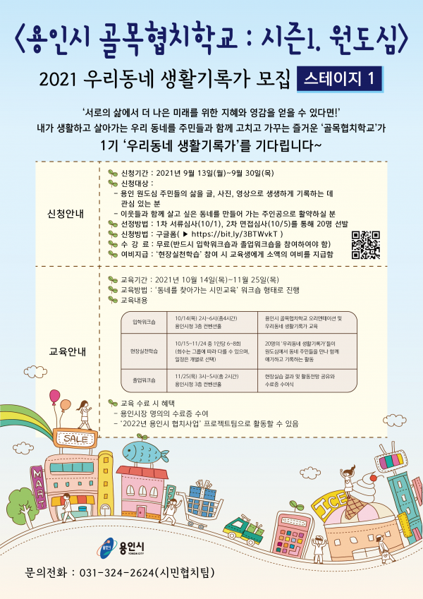 용인시가 오는 30일까지 ‘용인시 골목협치학교’에 참여할 시민들을 모집한다. 다음달 14일부터 11월25일까지 진행되는‘용인시 골목협치학교’는 지역의 문제에 관심을 갖고 활동할 ‘우리동네 생활기록가’양성을 위해 마련한 교육프로그램이다. 신청은 포스터 속 QR코드로 접속하거나 구글폼 URL(https://bit.ly/3BTWvkT)에 접속해 작성 후 제출하면 되고, 주민들의 삶을 글과 사진 영상으로 기록하는데 관심…