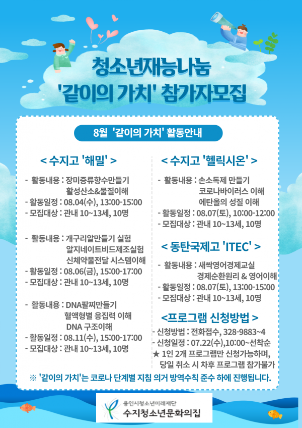 재단법인 용인시청소년미래재단 수지청소년문화의집에서는 오는 22일 부터 여름방학을 맞는 청소년을 위해 ‘같이의 가치’ 참가자를 모집한다. 프로그램으로는 ▲장미증류향수만들기(수지고 해밀), ▲개구리알만들기(수지고 해밀,) ▲새싹경제영어교실(동탄국제고 ITEC), ▲DNA팔찌만들기(수지고 해밀) ▲손소독제만들기(수지고 헬릭시온) 총 5가지 체험을 진행할 예정이다. 참가자 모집은 7월 22일(목) 10시부터 전화(0…