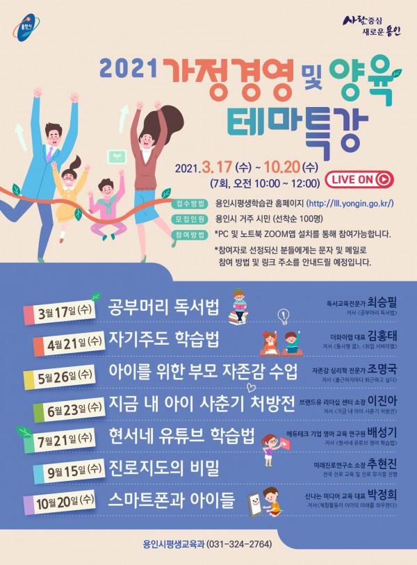 용인시가 건강한 가정환경 조성과 아이들의 인성교육을 돕기 위해 ‘가정경영 및 양육’을 주제로 한 무료 테마특강을 마련했다. 시는 지난 2016년부터 관내 학부모들이 자녀를 이해하고 올바른 부모의 역할을 하는데 도움이 될 수 있도록 전문가들이 참여하는 강좌를 매년 개최해왔다. 오는 10월까지 열리는 올해 테마특강은 양방향 소통이 가능한 ZOOM을 활용해 실시간으로 진행되며, 용인시평생학습관 홈페이지에서 8일부터 신청…