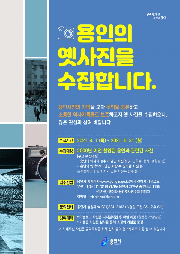 용인시가 시민의 소중한 추억을 공유하고 시의 옛 모습을 역사기록물로 보존하기 위해 ‘옛사진 수집’을 진행한다. 시가 1일부터 다음달 31일까지 진행하는 옛사진 수집은 지난 2000년 이전에 관내에서 촬영된 용인의 역사와 정취가 담긴 사진을 대상으로 한다. 용인 곳곳의 풍경, 골목, 건축물, 행사, 인물 등 시민의 생활상과 용인의 발전상이 담긴 사진이면 누구나 제출할 수 있다. 수량에는 제한이 없지만 흔들림…