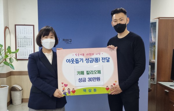 처인구 역삼동은 25일 카페 칼리오페 전상우 대표가 동 행정복지센터를 찾아 이웃돕기 성금 30만원을 기탁했다고 밝혔다. 카페 칼리오페는 역북동 소재 카페로 관내 홀로 어르신 등 어려운 이웃을 돕기 위해 성금을 기탁한 것이다. 동은 이날 기탁받은 성금을 경기사회복지공동모금회를 통해 관내 저소득 독거노인, 아동, 장애인 등 취약계층에게 전달할 예정이다. 전상우 대표는 “많은 금액은 아니지만 어려운 이웃들에게 보탬…