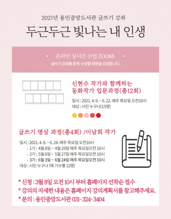 용인중앙도서관이 글쓰기 온라인 강좌 ‘두근두근 빛나는 내 인생’을 운영한다고 5일 밝혔다. 이번 강좌는 글쓰기에 대한 막연한 꿈을 가지고 있는 시민들이 글쓰기에 쉽게 다가가는 것을 돕기 위해 마련, 화상회의 앱인 ‘줌(ZOOM)’으로 신현수·이남희 작가의 강좌를 진행한다. 먼저 신현수 작가는 다음달 6일부터 6월 22일까지 매주 화요일 총 12회 에 걸쳐 ‘동화작가 입문과정’을 강의한다. 신 작가는 ‘플라…